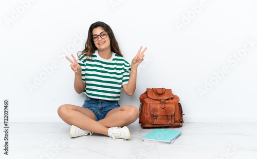Young student woman sitting one the floor isolated on white background showing victory sign with both hands