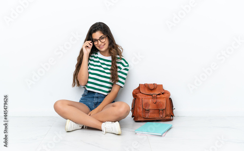 Young student woman sitting one the floor isolated on white background with glasses and happy
