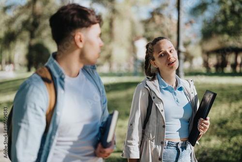 Young students with books engage in a post-exam discussion in a vibrant urban park on a sunny day.