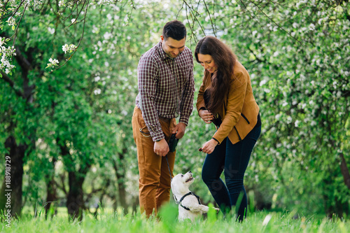 Young stylish happy couple in love playing with little white dog in blooming garden. Pretty girl and man having fun with maltese in park