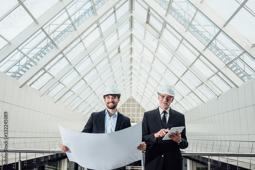 Young successful architect colleagues talking and analyzing blueprints while working on a new project at the factory under glass roof.