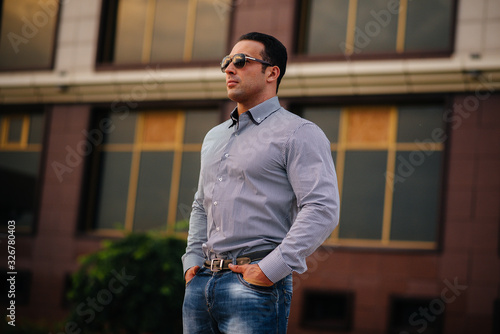 Young successful man near an office building. Business