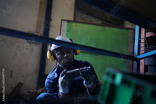Young successful technician or repairman of industrial machines in safety helmet and workwear standing in large garage or workshop