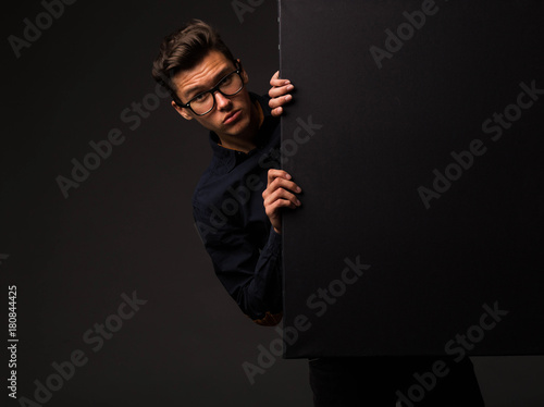 Young surprised man portrait of a confident businessman showing presentation, pointing placard black background. Ideal for banners, registration forms, presentation, landings, presenting concept.