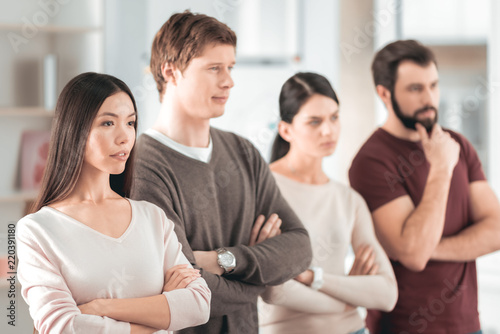 Young team. Serious young people standing together while being ready to work