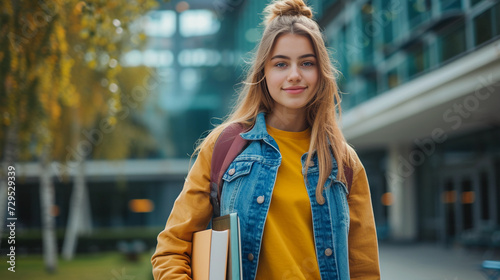 Young teenage university collage student, girl walking in campus with notebooks and backpack, portrait