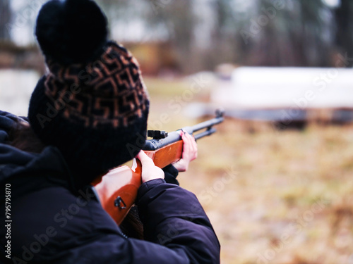 Young teenager girl win long nails aiming small caliber rifle. Selective focus. Nature area. Shooting practice for keeping reflexes sharp.