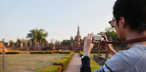young thai male tourist taking photo with camera at sukhothai historical park thailand