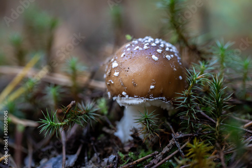 young toxic Panther cap mushroom in its natural wood enviroment. Selective focus, horizontal, copy space