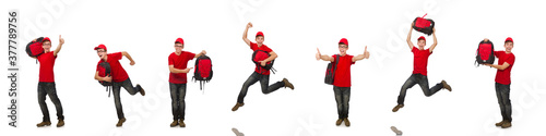 Young traveller with backpack isolated on white