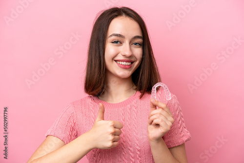 Young Ukrainian woman holding invisible braces isolated on pink background with thumbs up because something good has happened