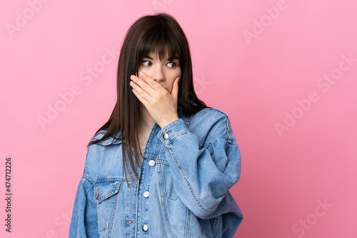 Young Ukrainian woman isolated on pink background doing surprise gesture while looking to the side
