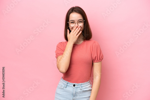 Young Ukrainian woman isolated on pink background happy and smiling covering mouth with hand