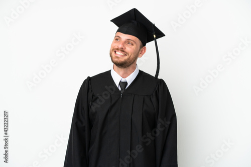 Young university Brazilian graduate isolated on white background thinking an idea while looking up
