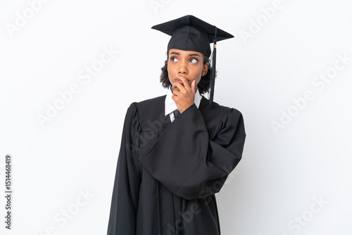Young university graduate African American woman isolated on white background having doubts and with confuse face expression