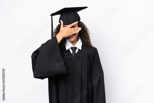 Young university graduate Arab woman isolated on white background covering eyes by hands and smiling