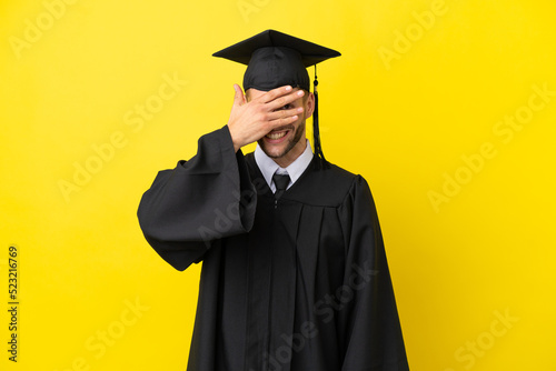 Young university graduate caucasian man isolated on yellow background covering eyes by hands and smiling