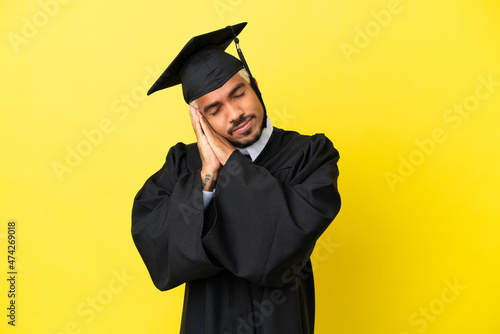 Young university graduate Colombian man isolated on yellow background making sleep gesture in dorable expression