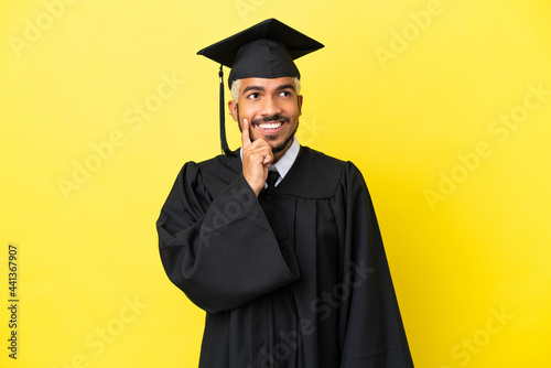 Young university graduate Colombian man isolated on yellow background thinking an idea while looking up