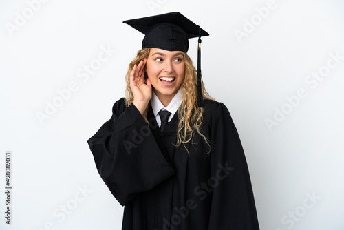 Young university graduate isolated on white background listening to something by putting hand on the ear