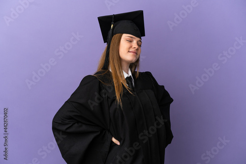 Young university graduate over isolated purple background suffering from backache for having made an effort