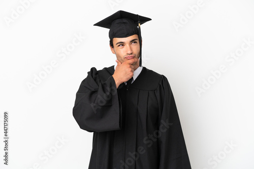 Young university graduate over isolated white background having doubts and with confuse face expression