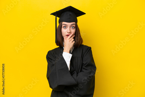 Young university graduate Ukrainian woman isolated on yellow background surprised and shocked while looking right
