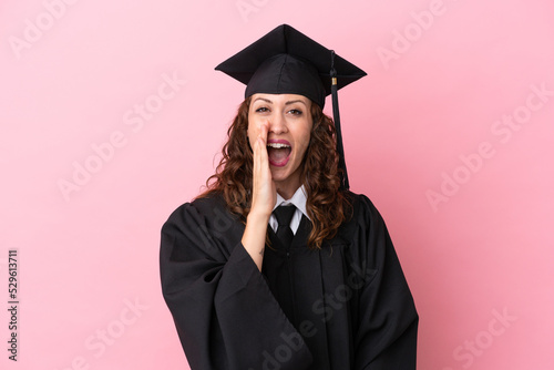 Young university graduate woman isolated on pink background shouting with mouth wide open