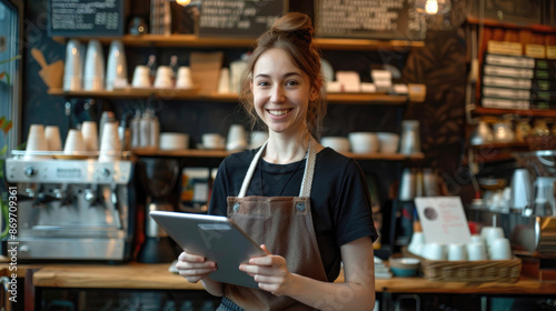 Young Waitress Smiling and Holding Tablet in Coffee Shop