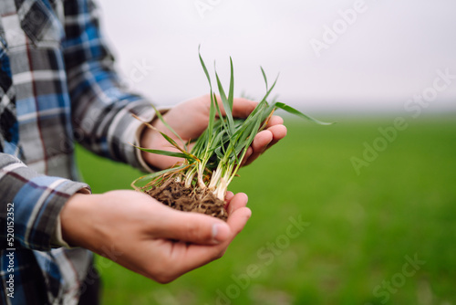 Young wheat sprout in the hands of a farmer. Agriculture, gardening or ecology concept.