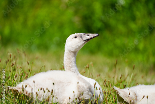 Young white swan sits in the grass. Cygnus. Bird close-up.