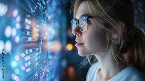 Young Woman Analyzing Data on a Digital Interface in a High-Tech Environment