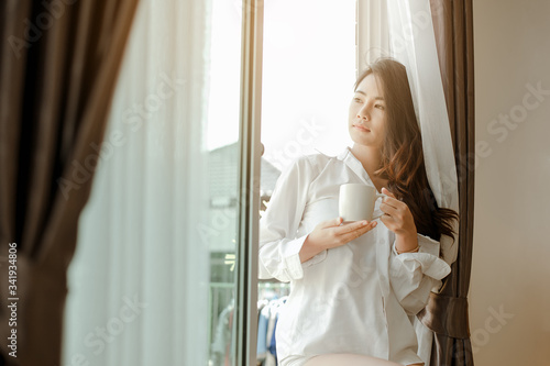Young woman asia living at home relaxing and drinking cup of hot coffee in the bedroom on holiday. Asian, asia, relax, alone, technology, lifestyle concept.