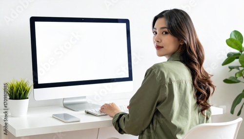 Young Woman at Desktop Computer in Bright Modern Workspace