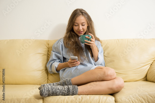 young woman at home drinking coffee and relaxing on couch using cellphone