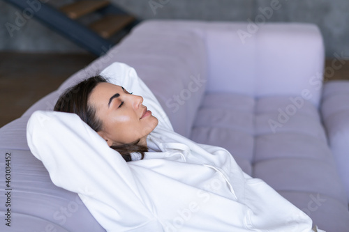 Young woman at home in a white hoodie on the couch serenely sits with closed eyes, relaxes, rests, meditates