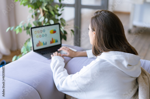 Young woman at home on sofa in a white hoodie with a laptop, advisor financial business analytics woman with data dashboard graphs