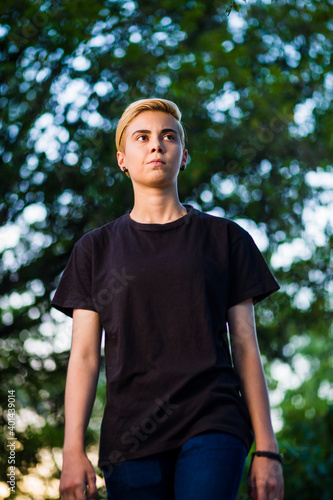 Young woman beauty Tomboy lifestyle with blonde short hair posing in casual clothes in a park in Spain. Jeans and t-shirt showing armes, gender education and non binary teen.