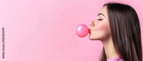 Young Woman Blowing a Pink Bubble Gum Bubble