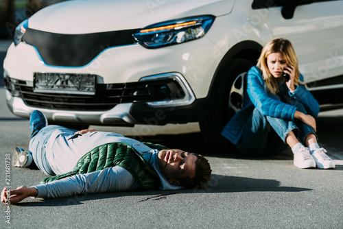 young woman calling emergency while injured man lying on road after motor vehicle collision