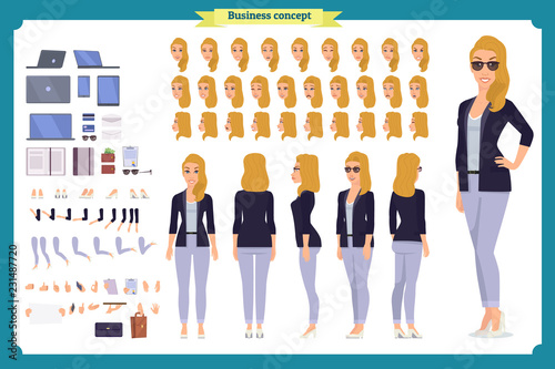 Young woman, casual clothes. Character creation set. Full length, different views, emotions, gestures, isolated against white background.
