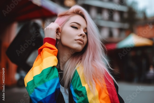 Young woman celebrating gay pride event wearing rainbow flag symbol of Lgbt social movement. Generative ai.