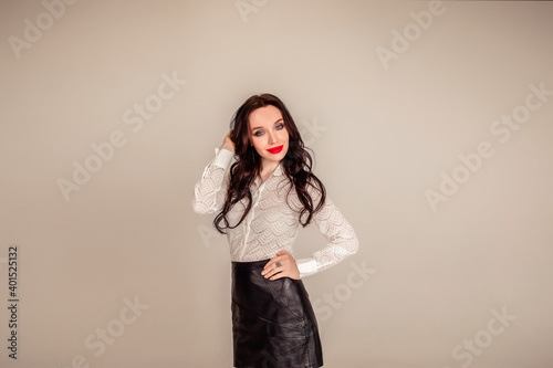 young woman closeup portrait. beautiful brunette girl with red lips on isolated over gray background. Copy space