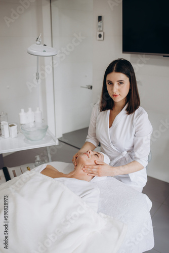 young woman cosmetologist in cosmetology clinic stands near the couch and smiles, girl dermatologist in doctor's uniform at the workplace.
