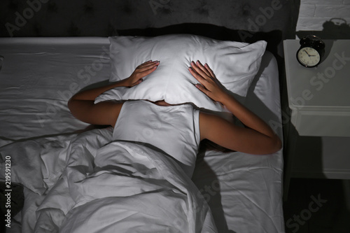 Young woman covering head with pillow in bed at home. Sleep disorder