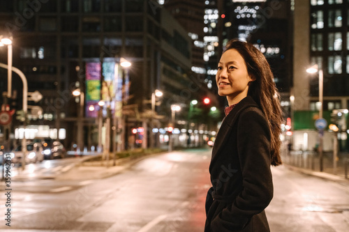 Young woman crossing the street in the city at night, Frankfurt, Germany