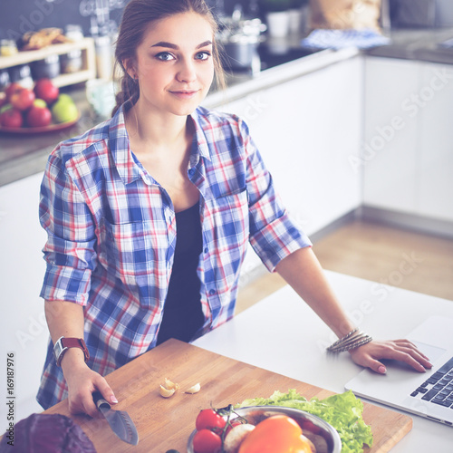 Young woman cutting vegetables in kitchen near desk