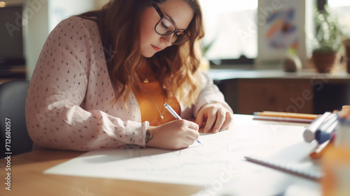 Young woman designer illustrator working at a project. Sitting at a desk drafting sketching on paper with pencil. Creative professional freelancer