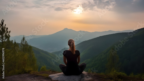 Young woman doing yoga outdoor. Background of beautiful mountains.