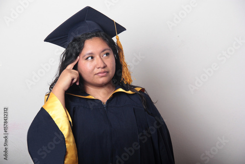 Young woman dressed in cap and gown celebrates her graduation and appears pensive and thoughtful